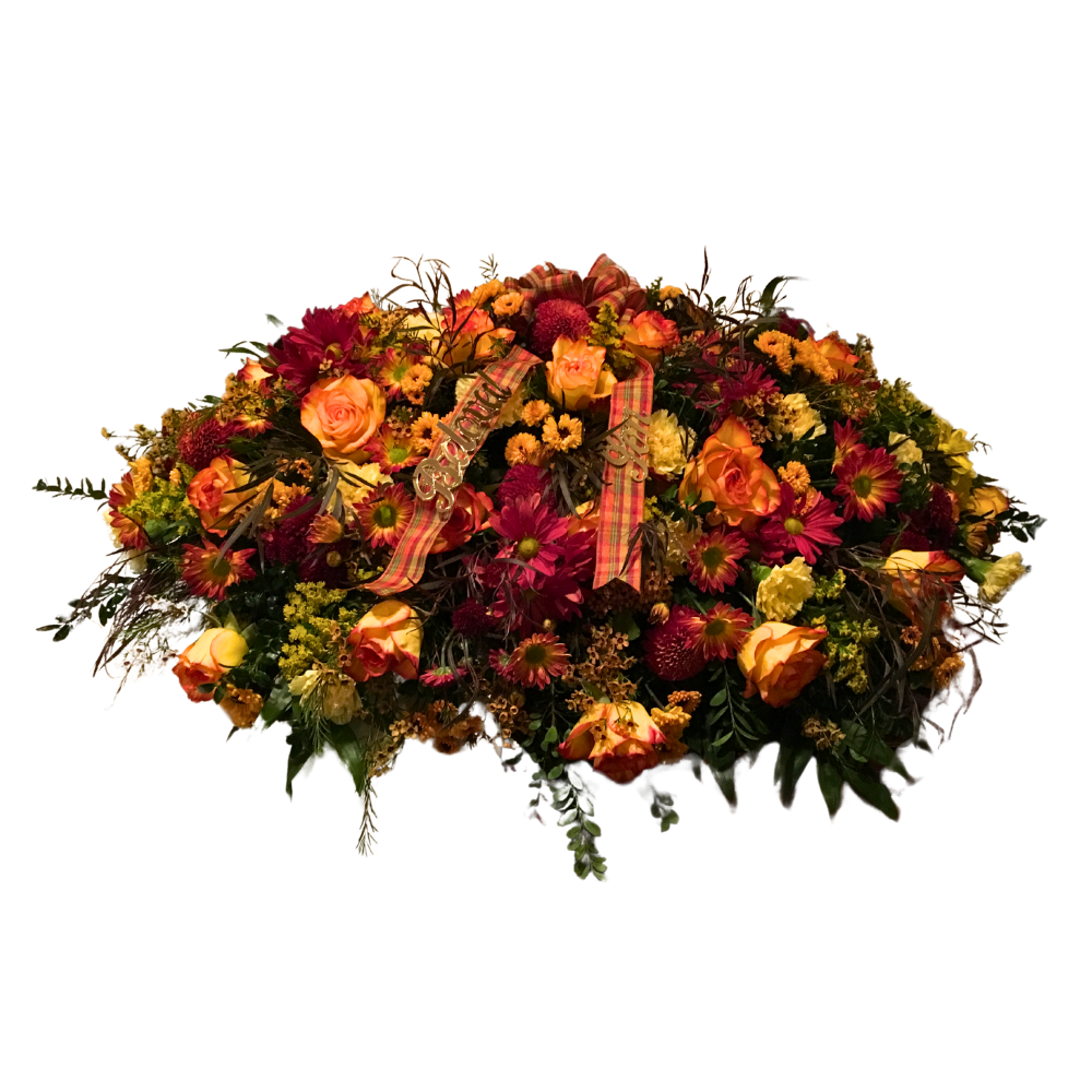 The Fall Sunset Casket Cover is a warm and radiant tribute, inspired by the rich hues of an autumn sky. A stunning blend of golden yellows, deep oranges, warm reds, and soft apricots is thoughtfully arranged among lush seasonal foliage, creating a heartfelt expression of love and remembrance. This vibrant design reflects the beauty of a life well-lived, offering a comforting farewell filled with warmth and grace.