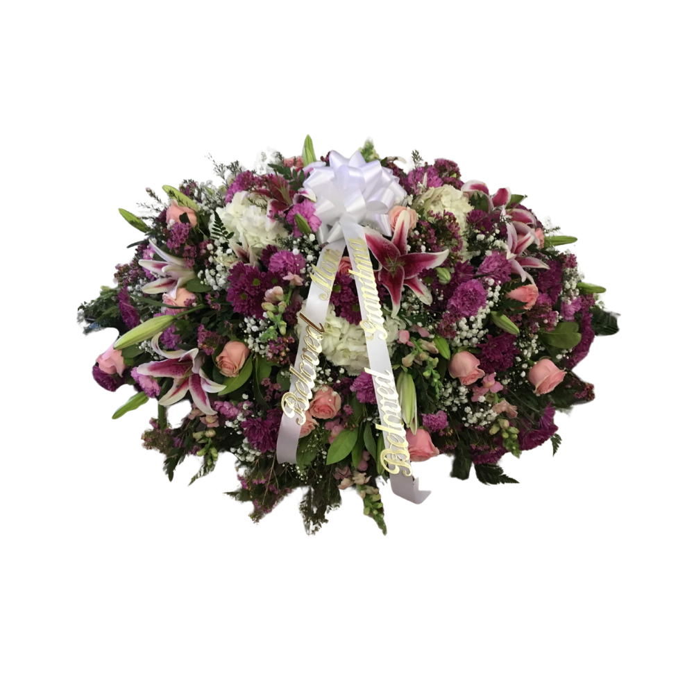 A graceful casket cover in soft pink and white tones, offering a gentle and loving tribute. This elegant arrangement symbolizes beauty, grace, and the tender memories shared with a loved one. The delicate blend of colors creates a calming and peaceful atmosphere, reflecting warmth and affection. Perfect for honoring a life with love and respect, it provides a timeless and heartfelt tribute during a memorial service.